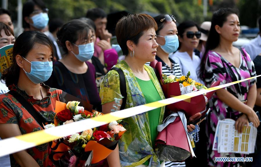 Os pais aguradam fora da escola enquanto os seus filhos participam do gaokao em Xi’an, na província de Shannxi, no noroeste da China, em 8 de julho de 2020.