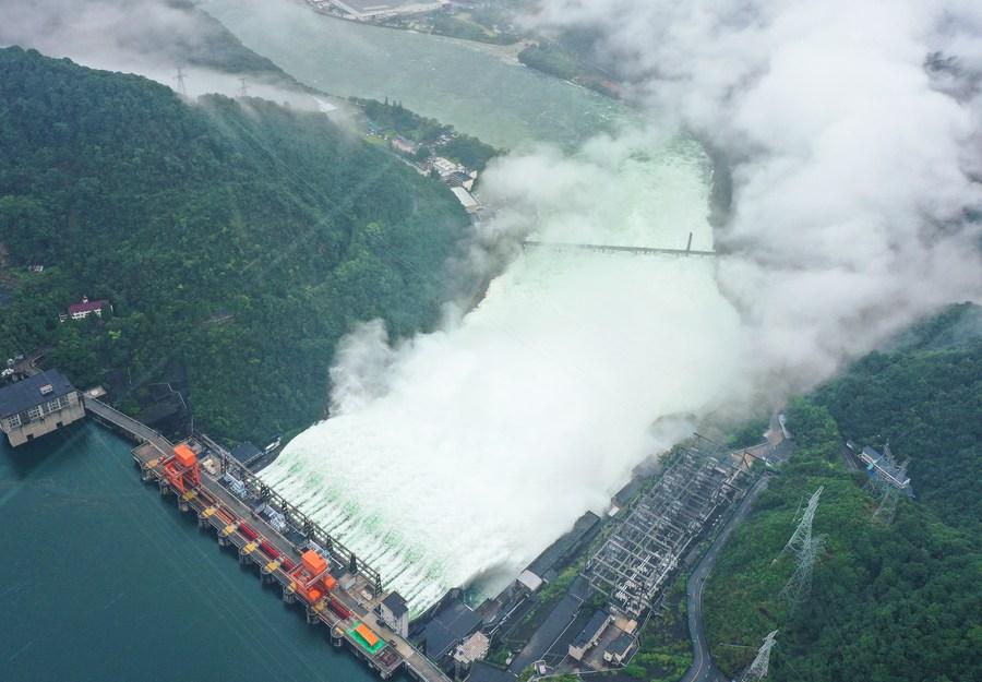 O reservatório do rio Xin'an, o maior projeto de controle de inunda??es no leste da China, abriu pela primeira vez as nove comportas na manh? de quarta-feira para liberar o excesso de água acumulada das enchentes.