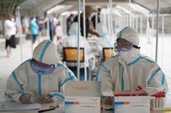 Integrantes da equipe médica trabalham num local de teste de ácido nucleico na rua Shoupakou Sul, distrito de Xicheng, Beijing, capital da China, 24 de junho de 2020. (Xinhua / Xing Guangli)