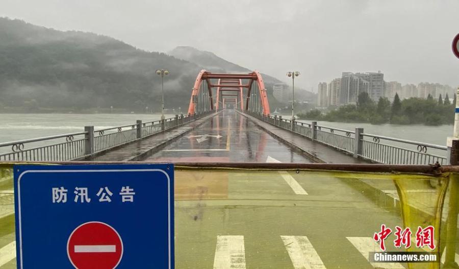 Ponte sobre o rio Xin 'an encerrada devido ao controle de inunda??es em Jiande, na cidade de Hangzhou, província de Zhejiang.