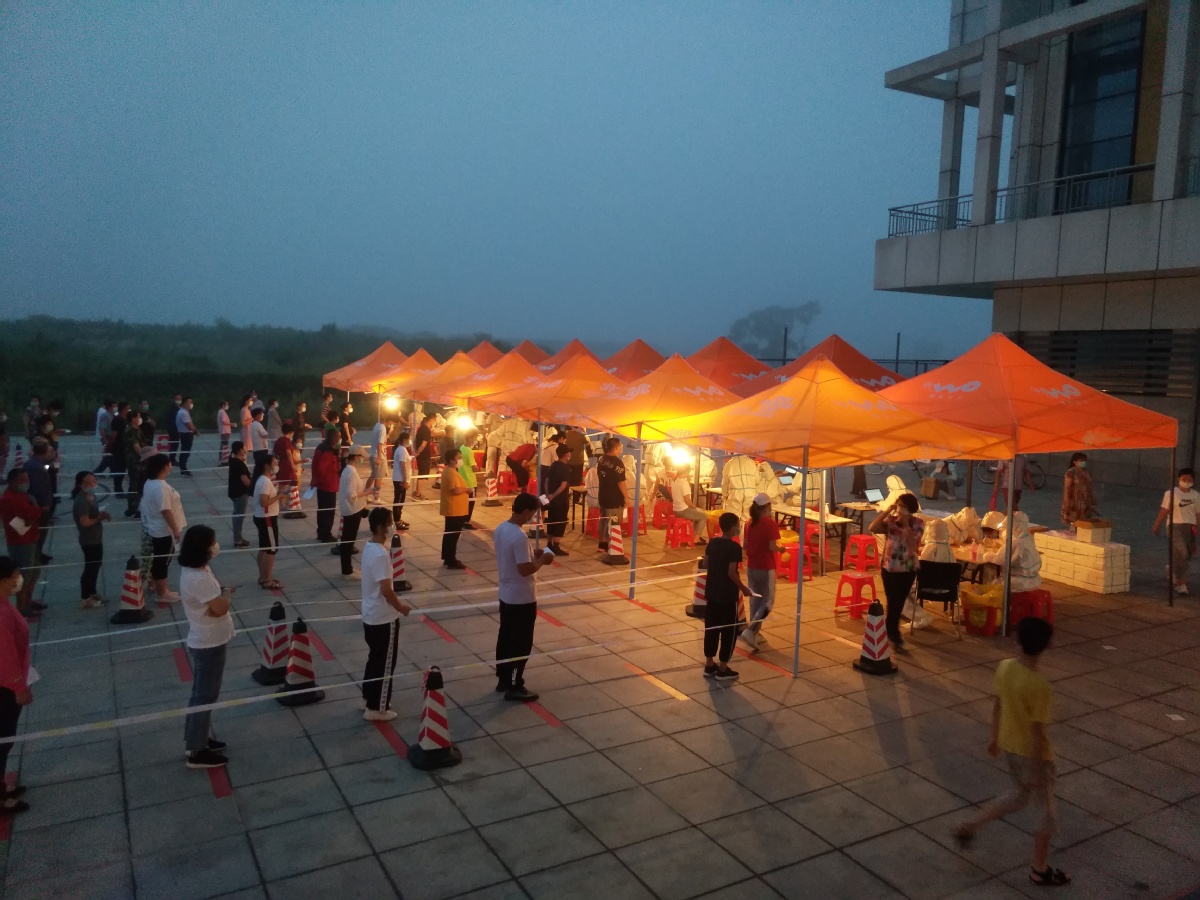 Moradores locais aguardam na fila para fazer o teste de ácido nucleico em uma área residencial no condado de Changhai, uma ilha em Dalian, província de Liaoning, na noite de 31 de julho de 2020. [Foto de Lin Jian / para chinadaily.com.cn]