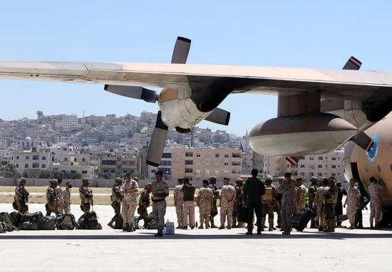 Membros do hospital militar de campo da Jordania se preparam para embarcar em um avi?o com destino a Beirute no Aeroporto Militar Marka em Am?, Jordania, 6 de agosto de 2020. (Xinhua / Mohammad Abu Ghosh)