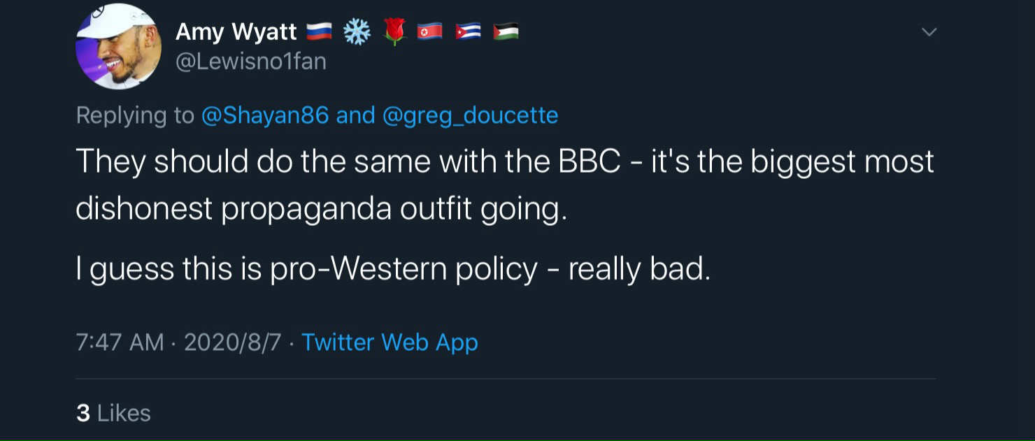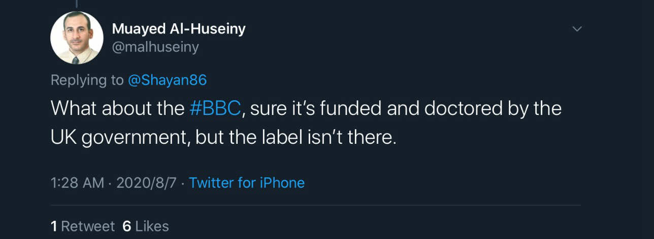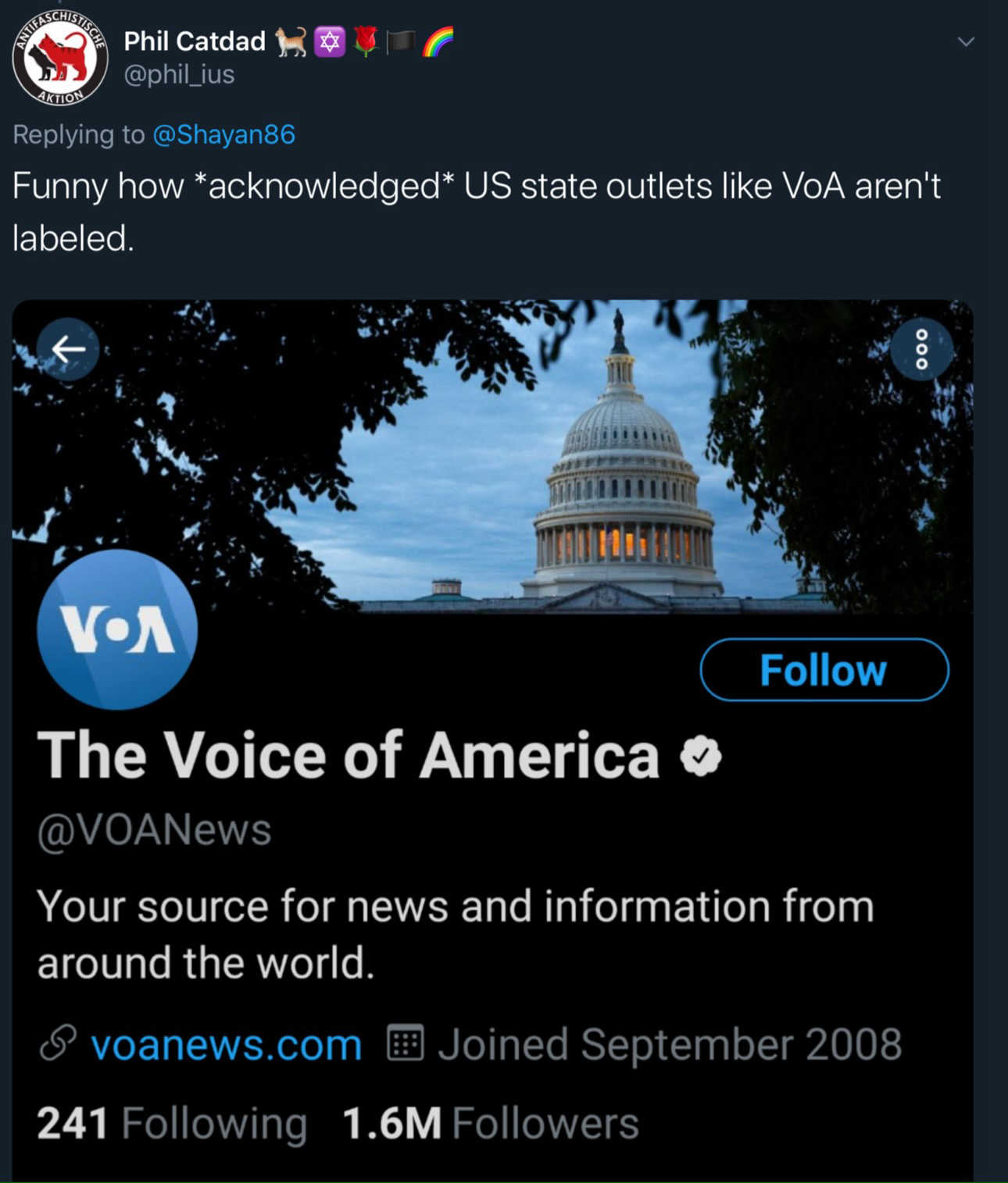 O Twitter na quinta-feira anexou um rótulo às contas de "entidades de mídia com afilia??o estatal" e seus funcionários, uma medida que desfere um duro golpe para meios de comunica??o de países como China e Rússia, enquanto a mídia ocidental com financiamento estatal, incluindo a BBC e a VOA s?o isentos deste tratamento devido à sua “independência editorial”, com público e especialistas de todo o mundo criticando o gigante da Internet pelos“padr?es duplos” e “viola??o da liberdade de express?o”.