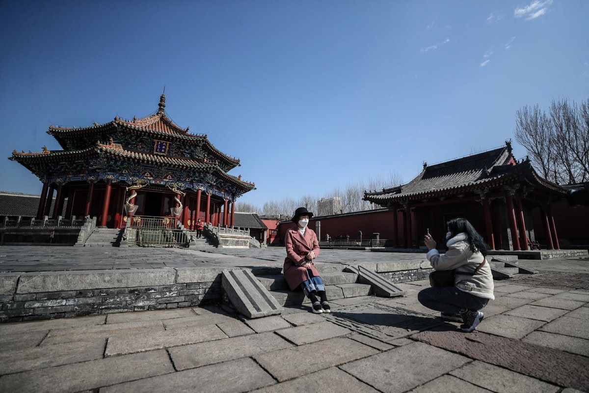 Um visitante tira fotos no Museu do Palácio em Shenyang, capital da província de Liaoning, no nordeste da China, em 17 de mar?o de 2020.