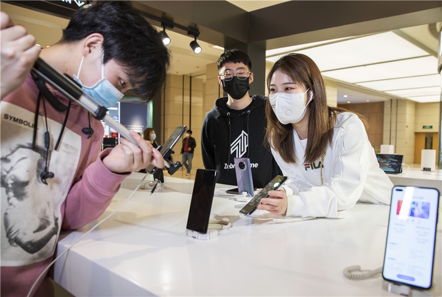 Funcionários vendem telemóveis via transmiss?o ao vivo em um centro comercial em Zhengzhou, capital da província de Henan, em 20 de mar?o de 2020.