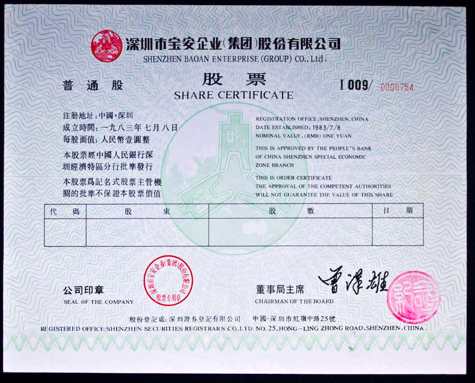 Em 8 de julho de 1983, a companhia Baoan Joint Investment Company Limited de Shenzhen emitiu ao público as primeiras a??es após funda??o da República Popular da China "Shen Baoan", marcando o nascimento da primeira sociedade an?nima de Shenzhen.