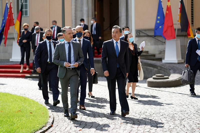 O conselheiro de Estado chinês e ministro das Rela??es Exteriores, Wang Yi, caminha com o ministro das Rela??es Exteriores da Alemanha, Heiko Maas, para uma entrevista coletiva em Berlim, Alemanha, em 1o de setembro de 2020. [Foto / Xinhua]