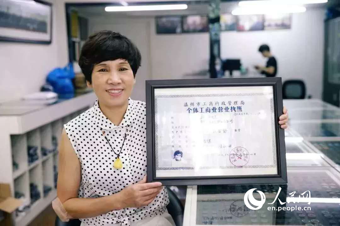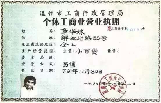 Ao saber da notícia, Zhang rapidamente se candidatou a uma licen?a comercial, enviando suas informa??es pessoais, duas fotos e uma descri??o da empresa. Em 1980, ela se tornou a primeira de mais de 2.000 vendedores em Wenzhou e transformou sua mesa numa loja. Os bot?es que ela vendia agora eram exibidos em balc?es.