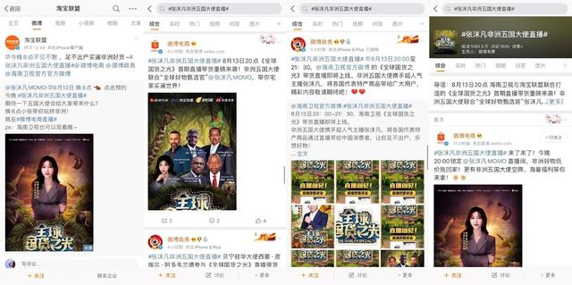 Um programa " Top Produtos Domésticos Globais ", lan?ado em conjunto pela Taobao Alliance e a Hainan Satellite TV, foi transmitido ao vivo pela Weibo e pela Hainan Satellite TV, em 17 de agosto.