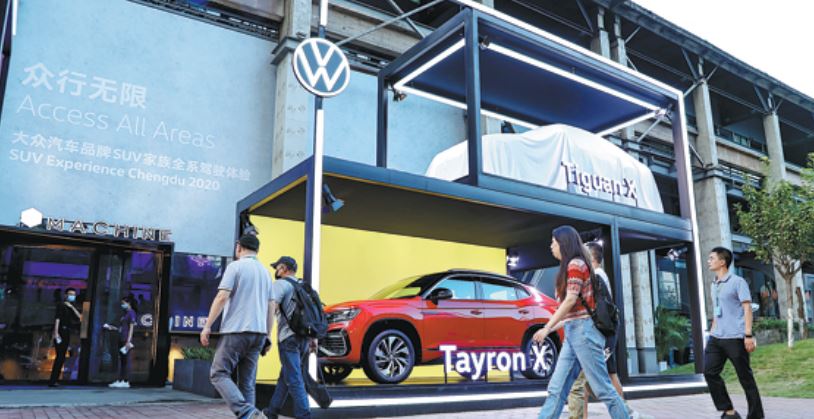 Os visitantes passam por veículos útilitários esportivos (SUV) da Volkswagen fora de um shopping em Chengdu, na província de Sichuan, em 6 de setembro. [Foto fornecida ao China Daily]