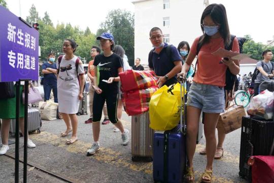 Os calouros chegam à Universidade Fudan de Shanghai no sábado (12) para se inscrever no sábado. Cerca de 4.000 calouros iniciaram sua vida no campus da universidade naquele dia. (Gao Erqiang / China Daily)