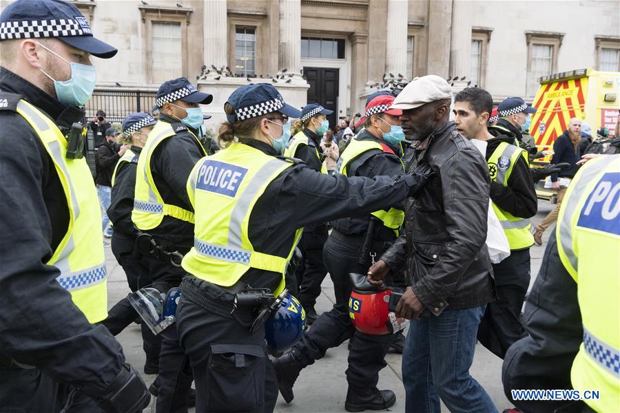 Segundo informa??es, pelo menos três manifestantes e um policial foram feridos e tratados pela equipe médica depois de entrarem em confronto no protesto contra quarentena no Trafalgar Square.