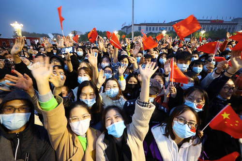 Ao ver a bandeira vermelha de cinco estrelas sendo hasteada até o topo do mastro, acompanhada do hino nacional, "A Marcha dos Voluntários", a multid?o eclodiu em aplausos e gritos de "Viva a República Popular da China!" e "Que a grande pátria seja próspera e forte!"