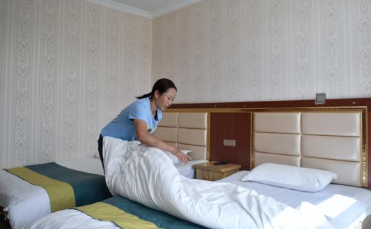 Shen Deping, residente na vila de Bayin em Chaka, província de Qinghai, arruma as camas no hotel administrado por sua família. Gra?as às liga??es ferroviárias, vários turistas visitando o lago de sal de Chaka, permitindo que as famílias como a de Shen tenham uma vida melhor. [Foto / Xinhua]