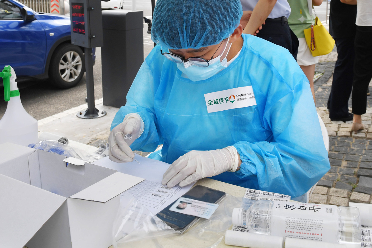Um trabalhador médico verifica os formulários de inscri??o num local de teste de ácido nucléico fora do Ginásio de Guoxin em Qingdao, província de Shandong, em 30 de julho de 2020. [Foto / Xinhua]