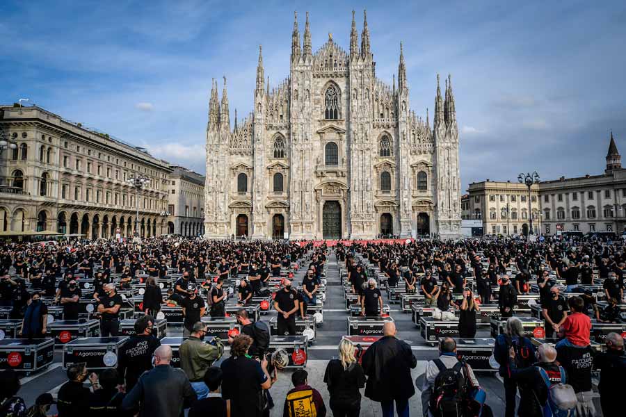 Trabalhadores da área de entretenimento se reúnem em frente à catedral Duomo em Mil?o no sábado para protestar contra as políticas do governo italiano em resposta ao novo coronavírus. Foto: Claudio Furlan / Imprensa associada
