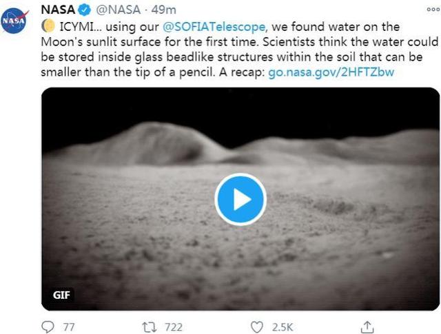 A Administra??o Nacional da Aeronáutica e Espa?o dos EUA (NASA) disse no dia 26 que as moléculas de água foram encontradas na superfície da lua iluminada pelo sol.
