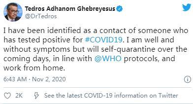 De acordo com relatos da mídia estrangeira, no dia 1 de novembro, hora local, o Diretor-Geral da OMS, Tedros Adhanom Ghebreyesus, confirmou ter contatado com pacientes infetados pela Covid-19 e que realizaria um período de isolamento, acrescentando que n?o detetou qualquer sintoma.