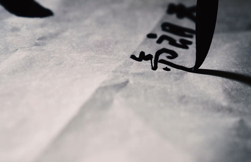 Um calígrafo tradicional pinta um poema chinês antigo.