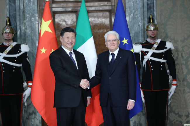 O presidente Xi Jinping aperta a m?o de seu homólogo italiano Sergio Mattarella em Roma, Itália, em 22 de mar?o de 2019. [Foto / Xinhua]