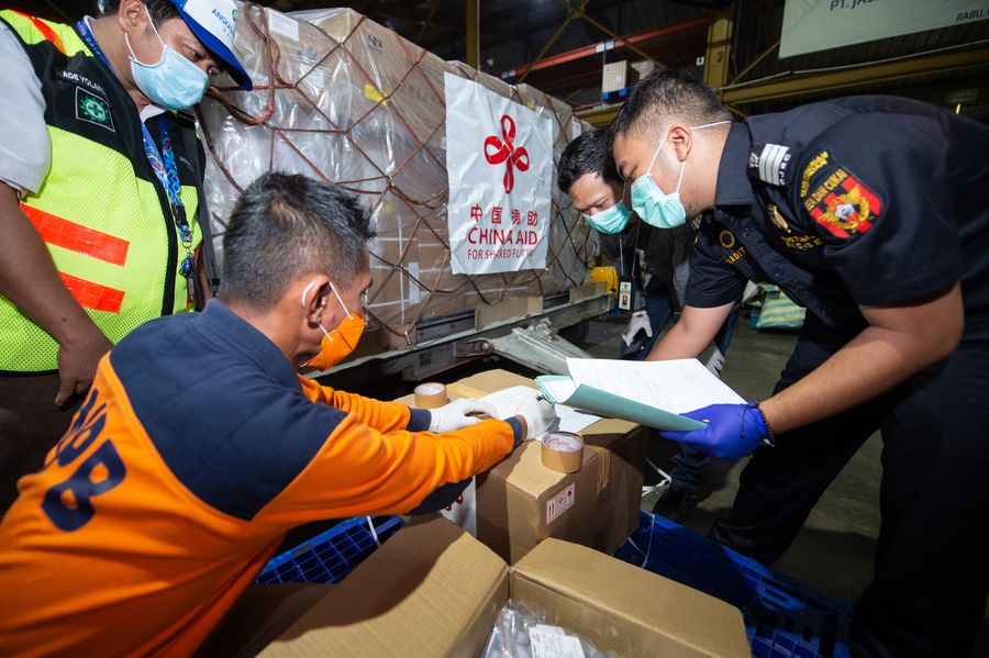 O Conselho Nacional de Gest?o de Desastres (BNPB, em inglês) e a alfandega da Indonésia recebem suprimentos médicos fornecidos pela China no Aeroporto Soekarno-Hatta em Jacarta, Indonésia, em 26 de mar?o de 2020. (Foto de arquivo: Xinhua)