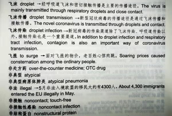 Recentemente, o "Dicionário do Novo Coronavírus Chinês-Inglês" foi publicado pela Editora da Universidade Fudan, complementando o "Dicionário do Novo Coronavírus Inglês-Chinês", publicado pela mesma institui??o em maio. Estes dois dicionários foram compilados no contexto da epidemia do coronavírus.
