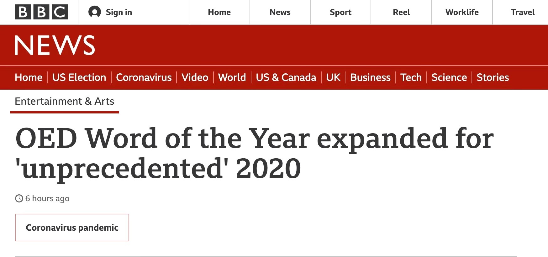A BBC relatou na segunda-feira (23) que, devido a vários eventos de grande magnitude ocorridos este ano, o Oxford English Dictionary publicado pela Oxford University Press no Reino Unido selecionou várias palavras, como novo coronavírus (Covid-19), teletrabalho (WFH), confinamento (lockdown), etc. Este ano, o uso da palavra "pandemia" também aumentou em mais de 57.000%.