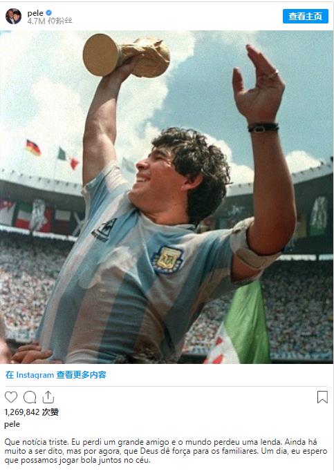 "Que notícia triste. Eu perdi um grande amigo e o mundo perdeu uma lenda. Ainda há muito a ser dito, mas por agora, que Deus dê for?a para os familiares. Um dia, eu espero que possamos jogar bola juntos no céu", escreveu Pelé.