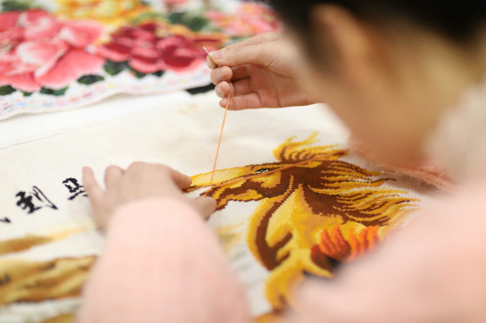 Uma jovem fazendo bordado numa “oficina de alívio da pobreza” na comunidade de Kangqiao, na província de Guizhou. Foto: Wang Changyu, Diário do Povo Online