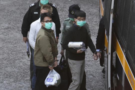 Ivan Lam Long-yin (à esquerda) e Joshua Wong Chi-fung entram em um veículo da pris?o, após se confessarem culpados de organizar e participar de uma assembléia n?o autorizada perto da Sede da Polícia em Wan Chai durante os protestos do ano passado, Centro de Recep??o em Lai Chi Kok, Hong Kong, na quarta-feira (2).
