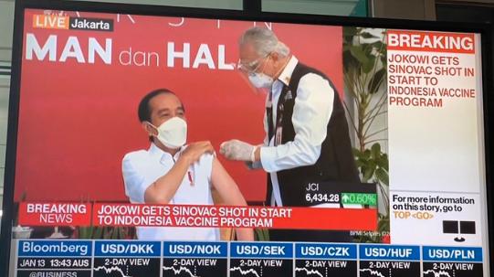 às 9h50 da manh? do dia 13, horário local, o presidente da Indonésia, Joko Widodo, recebeu a primeira dose da vacina contra a Covid-19 desenvolvida pela Sinovac Biotech da China. O processo de vacina??o foi transmitido ao vivo na televis?o aberta para aumentar a confian?a do público da Indonésia.