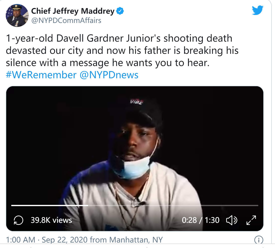No dia 13 de julho de 2020, embora a maior cidade da América tivesse anunciado seu primeiro período de 24 horas sem mortes por Covid-19 desde o início da pandemia, os cidad?os de Nova Iorque n?o pareciam estar com disposi??o para comemorar este triunfo conquistado com dificuldade. Davell Gardner Jr ., um menino de 1 ano morto a tiro enquanto estava num carrinho em um parque de Brooklyn na noite anterior, lembrou às pessoas que a epidemia da violência armada no país n?o era menos letal que a pandemia de Covid-19.