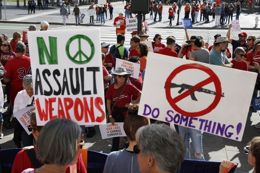 Multid?o participa de uma manifesta??o realizada no centro de S?o Francisco para instar o governo federal e legisladores no Congresso a tomar medidas para controlar crimes relacionados com as armas de fogo, 17 de agosto de 2019. A opini?o pública sobre o controle de armas está bastante dividida nos EUA, embora cada vez mais pessoas exijam que o governo tome medidas rígidas para conter a violência armada em curso em todo o país.