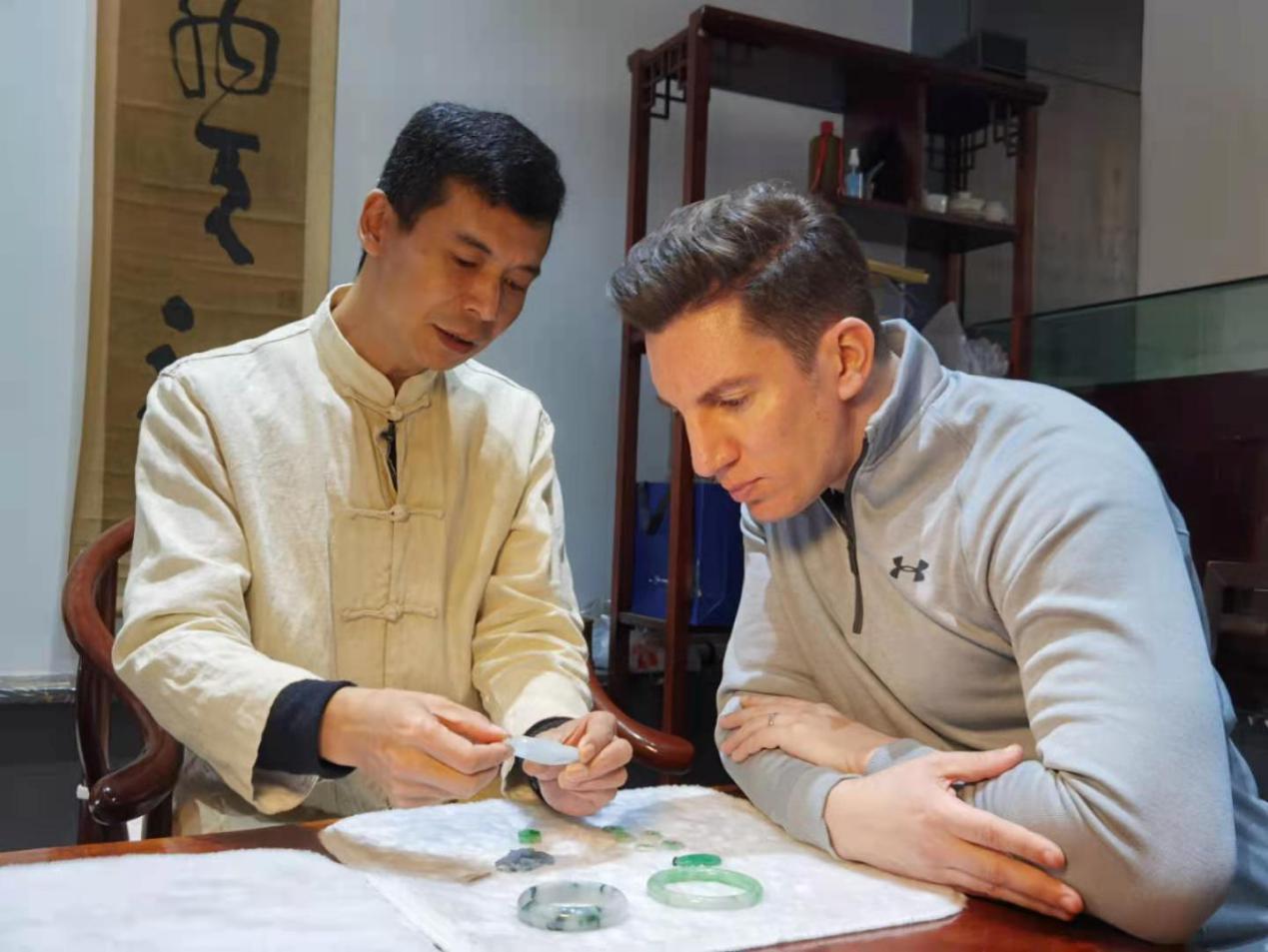 Yang Shuming apresenta a um visitante estrangeiro como identificar os diferentes tipos de jade. Foto: Xiang Xingquan/ Diário do Povo Online