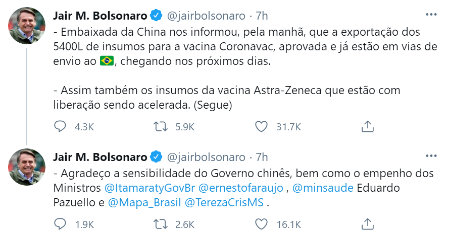 O presidente do Brasil, Jair Bolsonaro, publicou em suas redes sociais na segunda-feira que a exporta??o de 5.400 litros de insumos para a vacina CoronaVac está "em vias de envio ao Brasil" e deveriam chegar nos próximos dias, acrescentando que a libera??o dos insumos para a vacina AstraZeneca/Oxford também está sendo "acelerada".