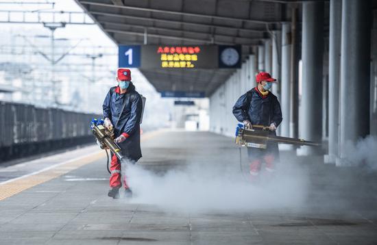 Voluntários desinfetam a plataforma da Esta??o Ferroviária Liupanshui, na Província de Guizhou, sudoeste da China, em 28 de janeiro de 2021. (Xinhua/ Tao Liang)