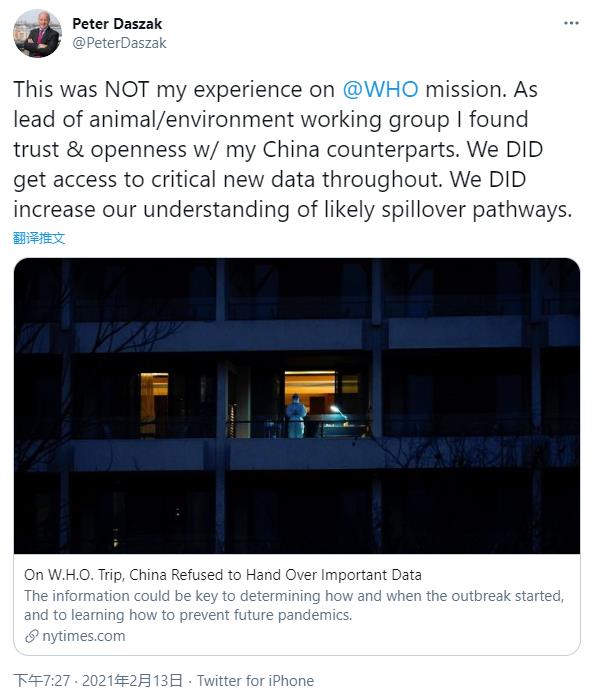"Esta N?O foi a minha experiência na miss?o da OMS. Como líder do grupo de trabalho animal/ambiental, encontrei confian?a e abertura dos meus colegas da China. Nós TIVEMOS acesso a novos dados críticos durante todo o tempo. Nós AUMENTAMOS nossa compreens?o dos caminhos prováveis de propaga??o", esclareceu Peter Daszak, membro da equipe da OMS, no Twitter depois de ser citado pelo The New York Times.