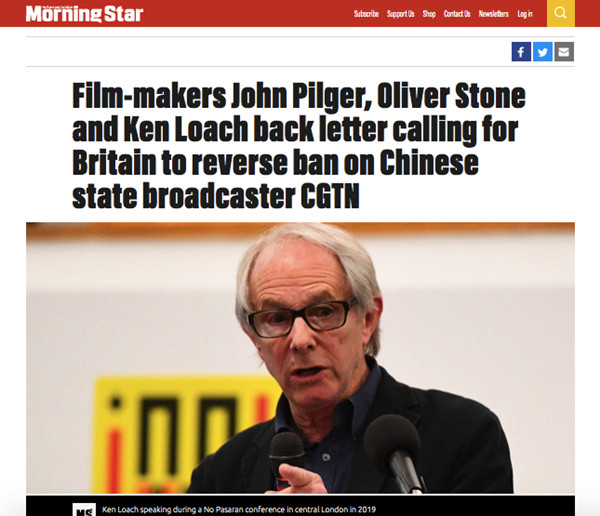 Celebridades internacionais divulgaram em conjunto uma carta aberta assinada no jornal britanico Morning Star e no site oficial da institui??o No Cold War na ter?a-feira (9), opondo-se à proibi??o do Escritório de Comunica??es do Reino Unido (Ofcom, na sigla em inglês) contra a Rede Global de Televis?o da China (CGTN, na sigla em inglês).