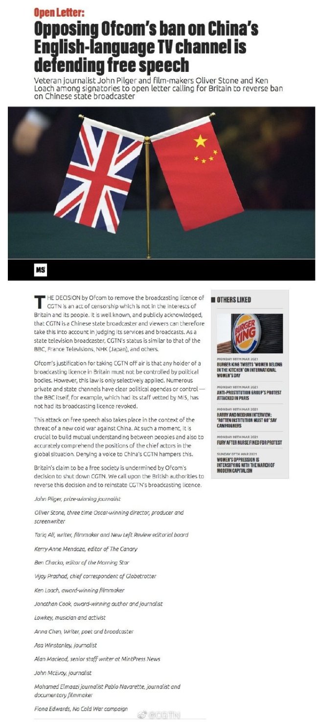 Na carta aberta intitulada “Opor-se à proibi??o do Ofcom contra a CGTN e defender a liberdade de express?o”, as celebridades apelaram às autoridades britanicas para que revoguem a proibi??o contra a CGTN e recuperem sua licen?a de radiodifus?o, afirmando que tal interdi??o é uma “censura que vai contra os interesses do Reino Unido e seu povo”.
