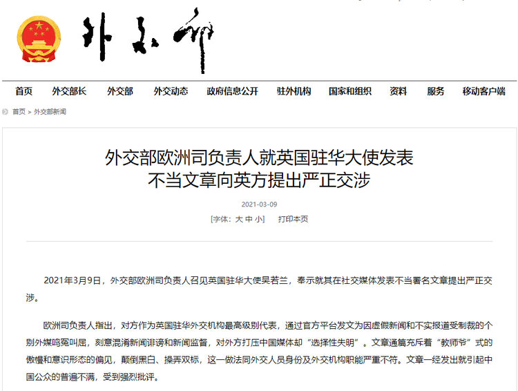 Um oficial do Departamento de Assuntos Europeus do Ministério das Rela??es Exteriores da China convocou na ter?a-feira (9) a embaixadora britanica na China, Caroline Wilson, apresentando representa??es solenes sobre a publica??o de um artigo impróprio nas redes sociais.