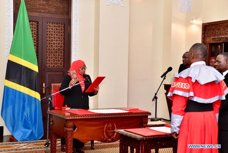 A cerimónia de tomada de posse foi sediada na Casa do Estado, na capital comercial de Dar es Sal?, após a morte do presidente John Magufuli na quarta-feira.