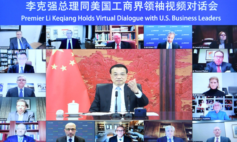 O primeiro-ministro chinês Li Keqiang em um diálogo virtual com líderes empresariais dos EUA na ter?a-feira em Beijing.