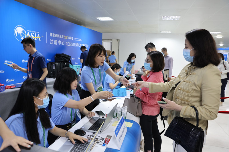 Trabalhadores distribuem brochuras da Conferência Anual do Fórum Boao para a ásia aos participantes no centro de inscri??es do evento em Boao, província de Hainan, no domingo. [Foto: Feng Yongbin / China Daily]