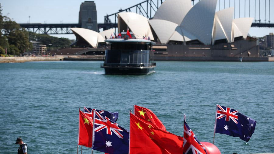 Bandeiras nacionais da China e da Austrália dispostas em um evento comemorativo em Sydney, Austrália, em 8 de setembro de 2019. [Foto / Xinhua]