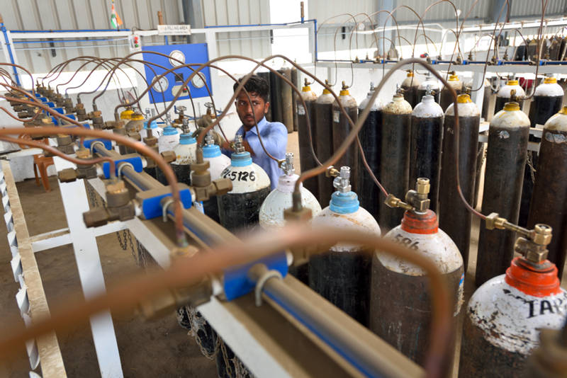 Um trabalhador preenche cilindros de oxigênio para uso médico numa fábrica de gás em Mumbai, índia, no domingo. [Foto / Agências]