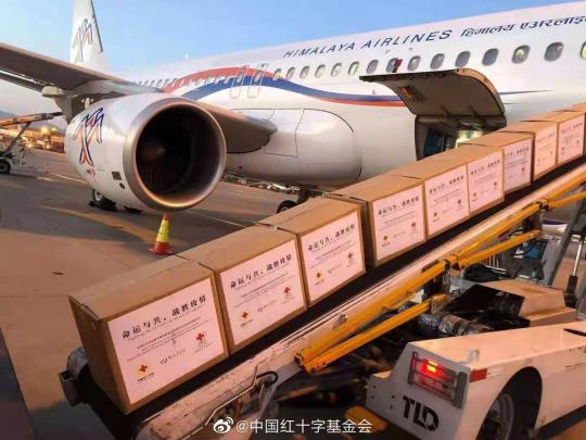O primeiro lote de materiais antipandêmicos doados pela Cruz Vermelha da China ao Nepal come?a a ser transportado para sua capital, Kathmandu, na manh? de quarta-feira, em Kunming, capital da província de Yunnan. (Foto / Sociedade da Cruz Vermelha da China)