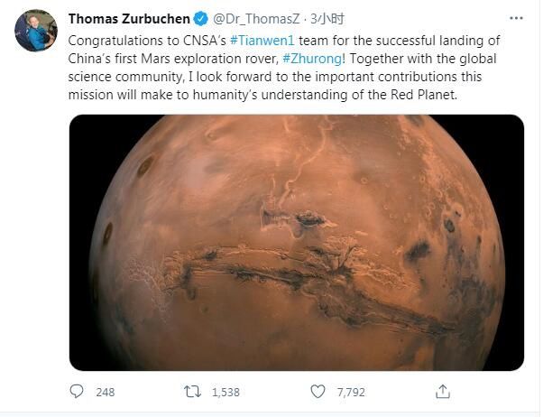 Depois que a sonda "Tianwen-1" pousou com sucesso em Marte, às 9 horas, horário de Beijing, em 15 de maio, a Administra??o Nacional da Aeronáutica e Espa?o (NASA) retuitou um post do seu Diretor Adjunto da Miss?o Científica, Thomas Zubchin: