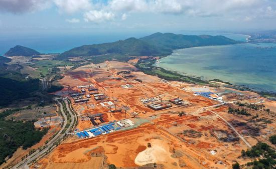 Foto aérea tirada em 4 de abril de 2021 mostra o local de obra da zona piloto de inova??o educacional internacional Li'an na península de Li'an do condado aut?nomo de Lingshui Li, província de Hainan, no sul da China. (Xinhua / Guo Cheng)