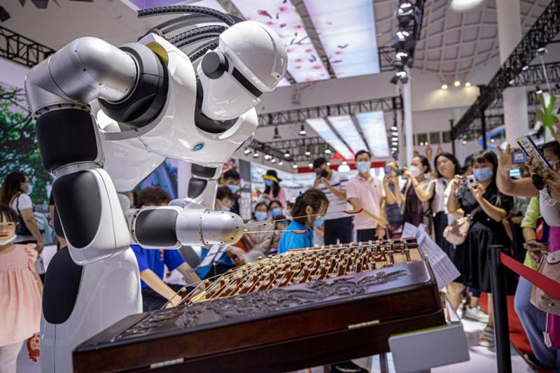 Rob? toca um instrumento musical na Exposi??o Internacional de Produtos de Consumo da China em Hainan, a 9 de maio de 2021. Zhang Wujun/ Diário do Povo Online