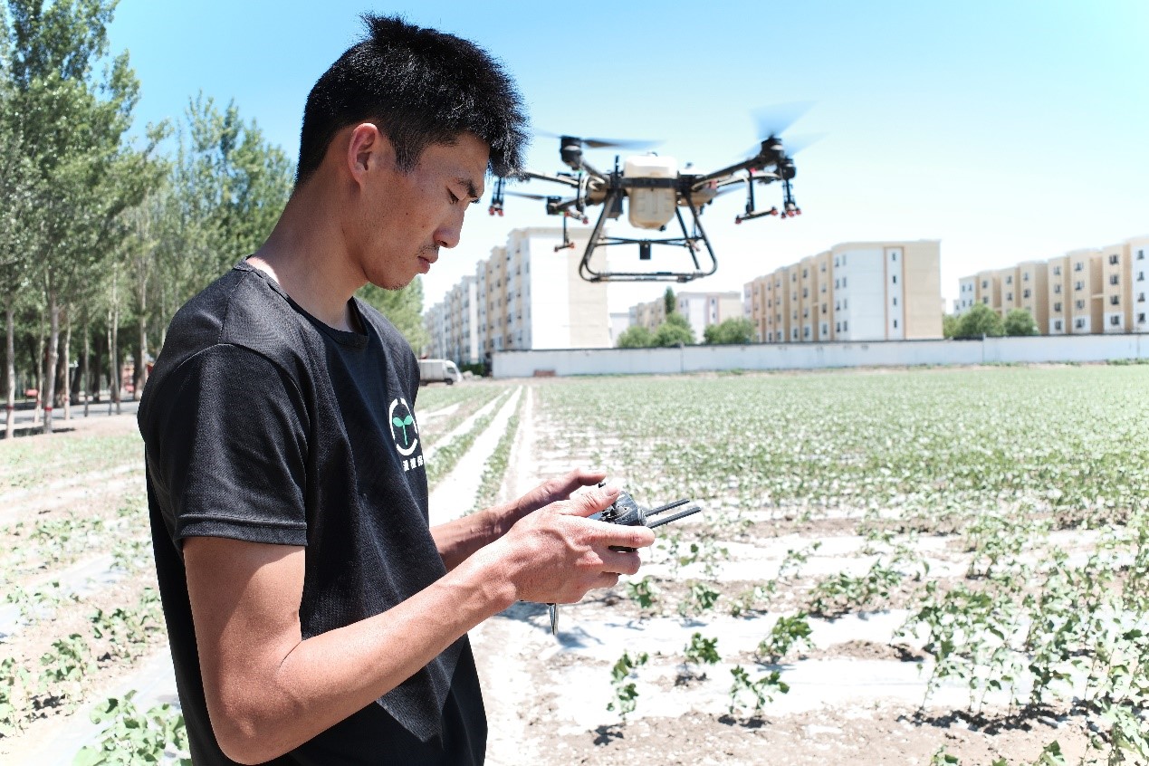 Hu Xinliang, um operador de drone, pilota seu drone para pulverizar inseticida nos campos de algod?o de Shihezi, Regi?o Aut?noma Uigur de Xinjiang, localizada no noroeste da China, em 1o de junho de 2021. (Foto: Kou Jie/ Diário do Povo Online)